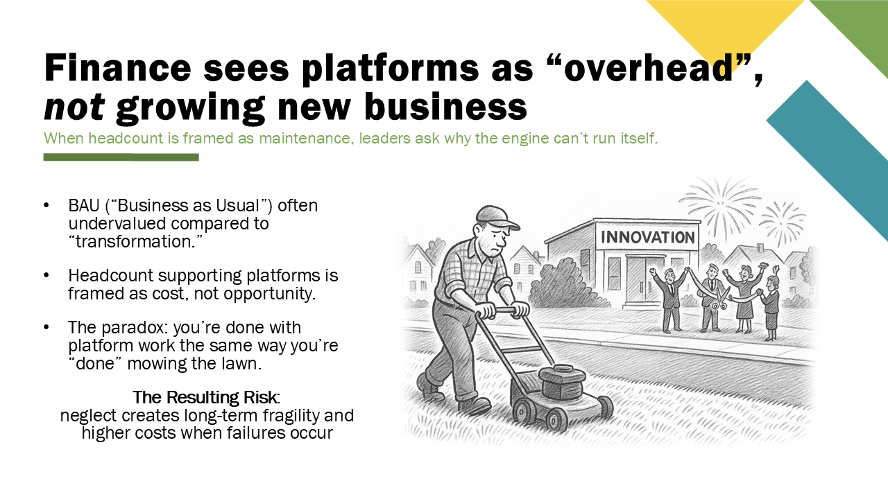 The third reason why this happens is that finance frames platforms as business as usual (or BAU) overhead, not innovation.