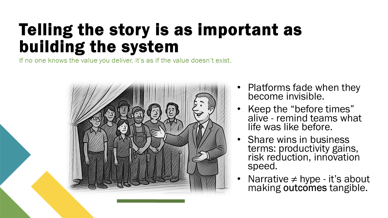 Building the platform isn’t enough. You also need to tell the story of what it does. Left alone, people forget how bad things were before. They reset their expectations and stop noticing your impact. Narrative work means showing the before-and-after, in terms business leaders care about. If you don’t make the value visible, it may as well not exist.