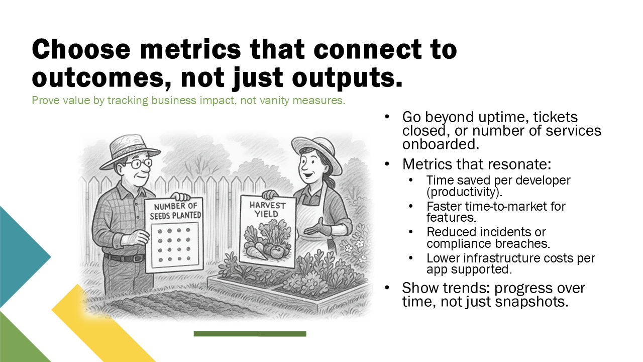 Every platform produces numbers. But most don’t matter to the people holding the budget. Counting services onboarded or uptime doesn’t tell finance or executives why the platform is valuable. The right metrics connect directly to business impact: time saved, cost avoided, risk reduced. And they should be trended over time to show progress, not just raw figures. Metrics are the evidence for your narrative.”