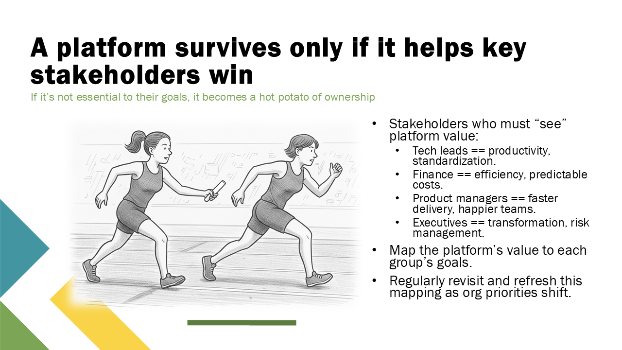 If the platform doesn’t help the right people achieve their goals, it will get bounced around like a hot potato. Tech leads, finance, product, executives all need to see the platform as advancing their own priorities. Stakeholder mapping means aligning your story and metrics to each audience. When they can point to the platform as the reason they succeeded, that’s when funding and support are sustained.