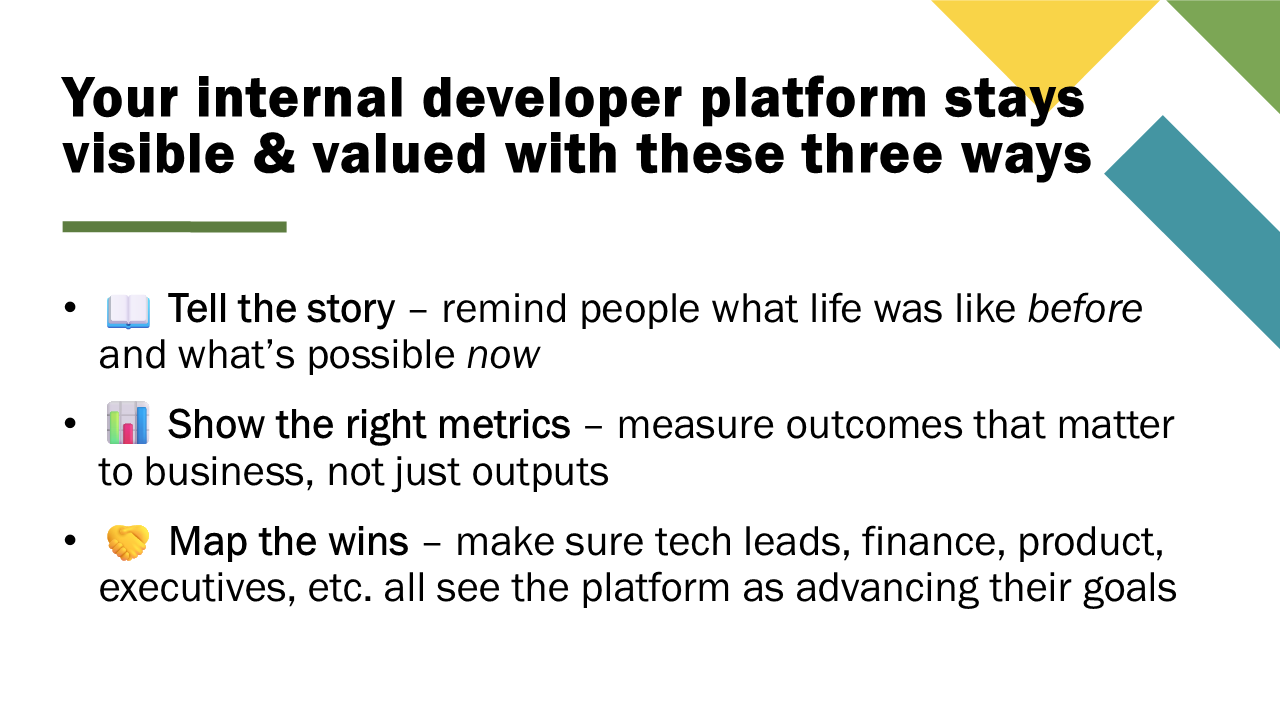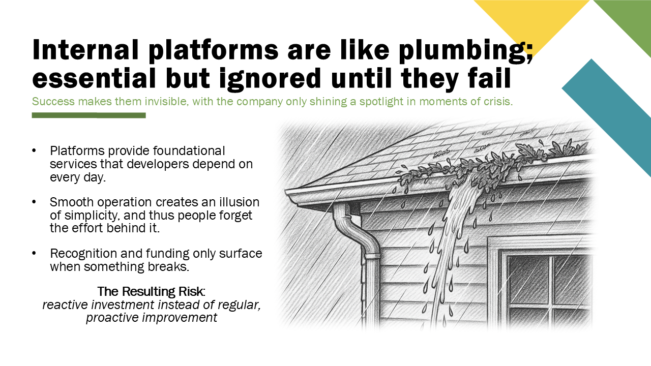 My goal is that you leave here not just with a new insight or two, but with practical approaches you can apply to ensure your internal developer platforms remain recognized as essential to your company’s success and don’t become invisible plumbing.