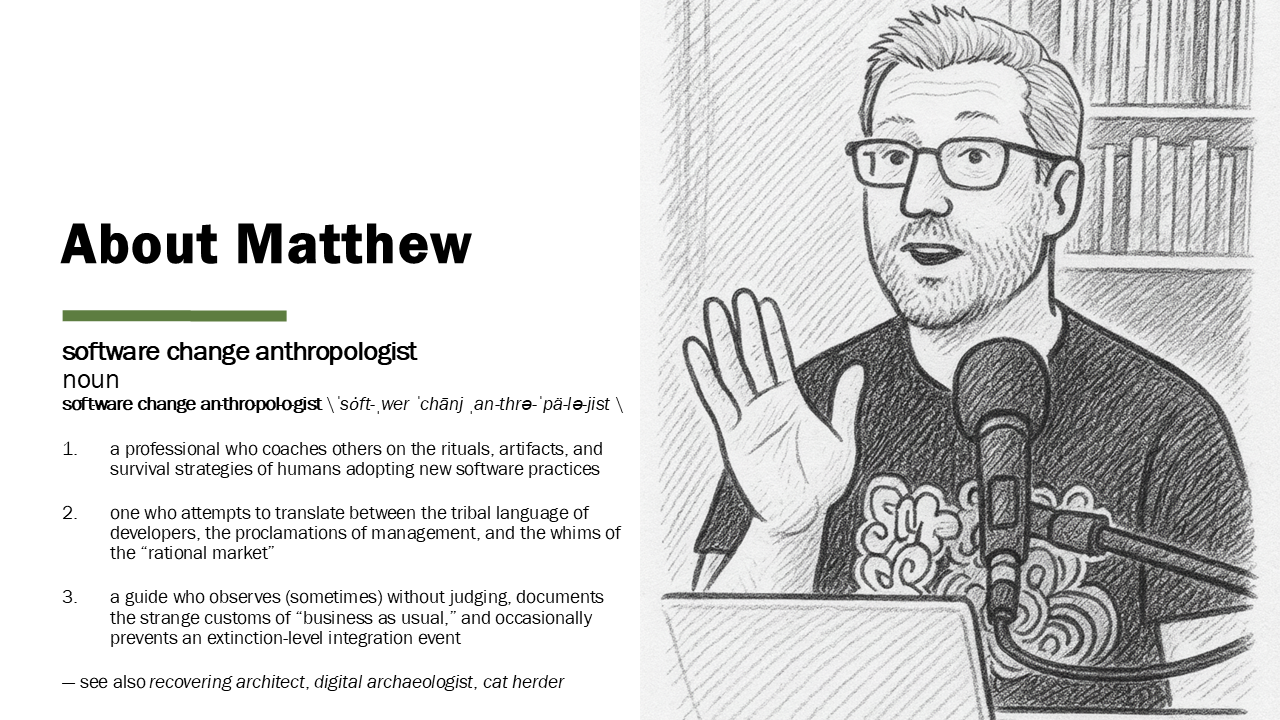 As was mentioned, my name is Matthew, and I’ve worn many hats over the years. I’ve been a software developer, an architect, product manager, writer, speaker, conference organizer, entrepreneur, and more.
