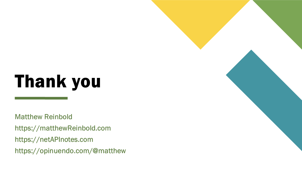 In addition to that site, you can also find my writing at my email newsletter, Net API Notes. Finally, if you’re on the Fediverse – like on the Mastodon platform – and would like to continue this conversation, you can find me at opinuendo.com/@matthew; I’d love to hear from you directly.