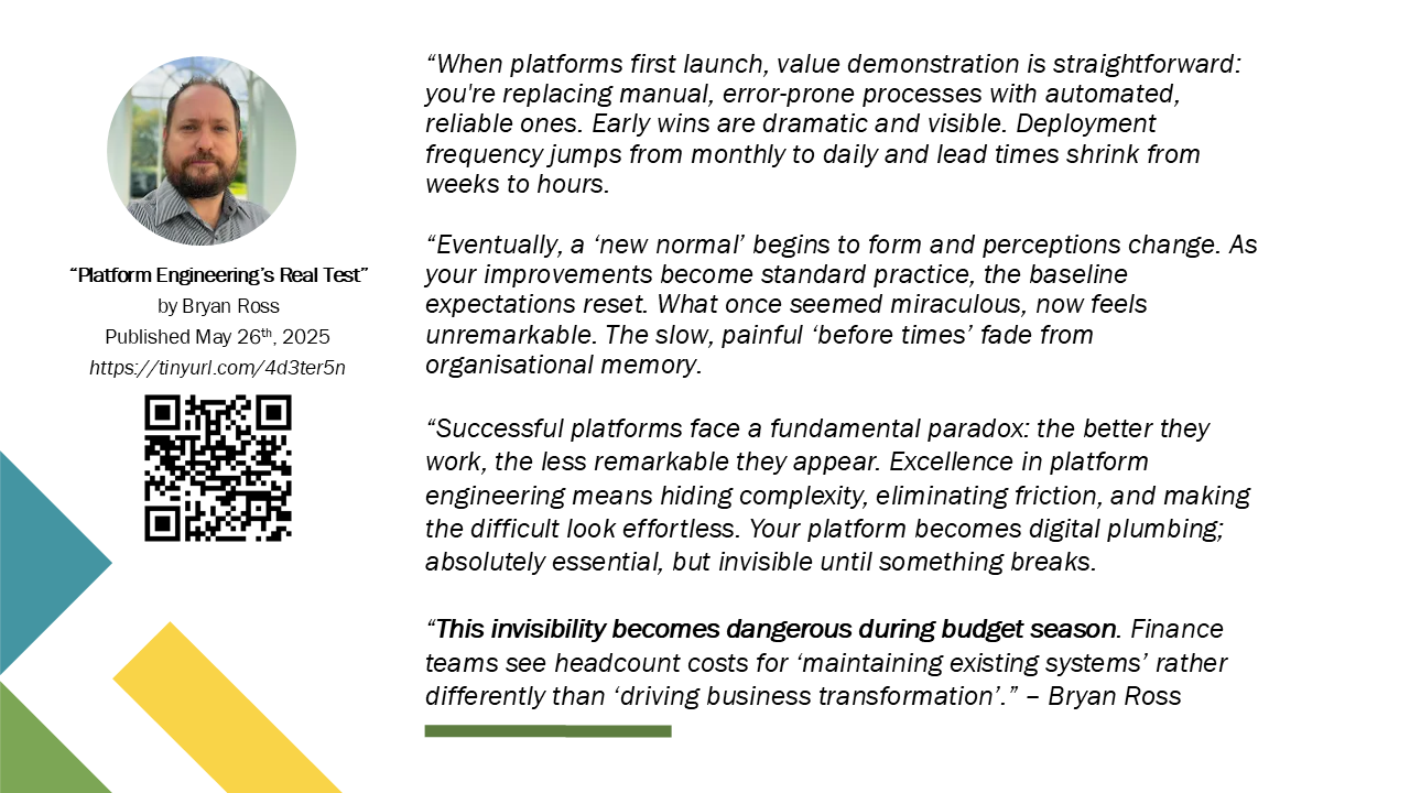 In today’s climate, every software investment is under scrutiny, and Internal Developer Platforms (or IDPs) that can’t demonstrate short-term value are on the chopping block. Yet many IDPs built in the last decade are now invisible; assumed rather than celebrated. This talk offers a survival guide: why invisibility is dangerous, how macroeconomic pressures magnify the risk, and some practical steps to avoid the worst of the downsides.